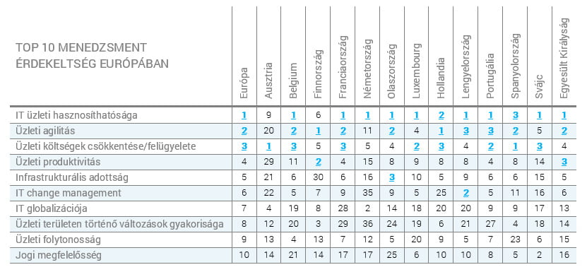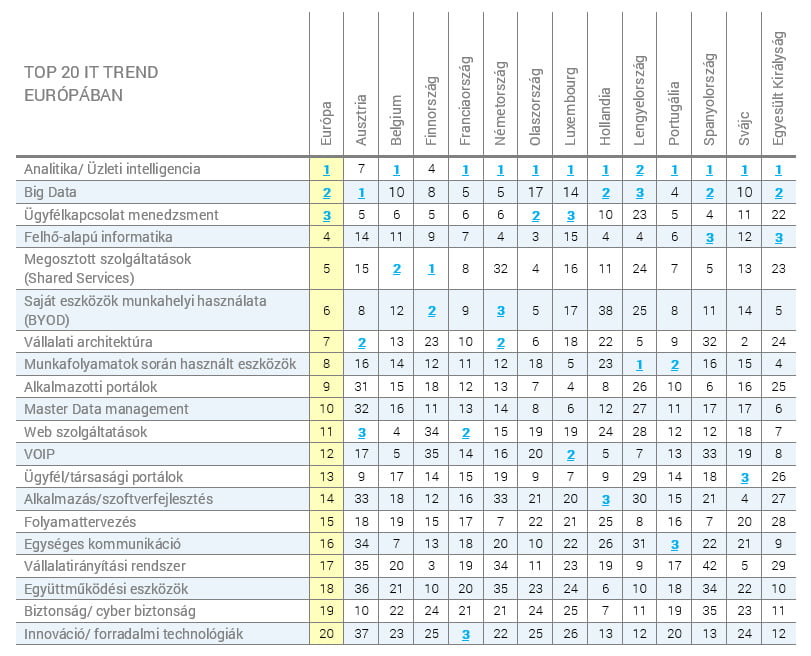 Azok a fontosabb újdonságok, melyek az európai piacon egyre jobban elterjednek, lassan hazánkat is elérik. Az európai kutatásban például első az üzleti intelligencia rendszer használata. Ez már hazánkban is egyre ismertebb, a cégvezetők zöme már tudja, hogy hogyan működik és mi a célja ezeknek a szoftvereknek. Különféle adatbázisokra, ERP rendszerekre illesztik rá az üzleti intelligencia szoftvert, így az adatok sokkal könnyebb felhasználása válik elérhetővé az ügyvezetők számára. Több külföldi rendszer mellett találhatunk a piacon hazai fejlesztésű üzleti intelligencia rendszert is mely büszkén veheti fel a versenyt a nagyobb, külföldi konkurenciáival szemben.