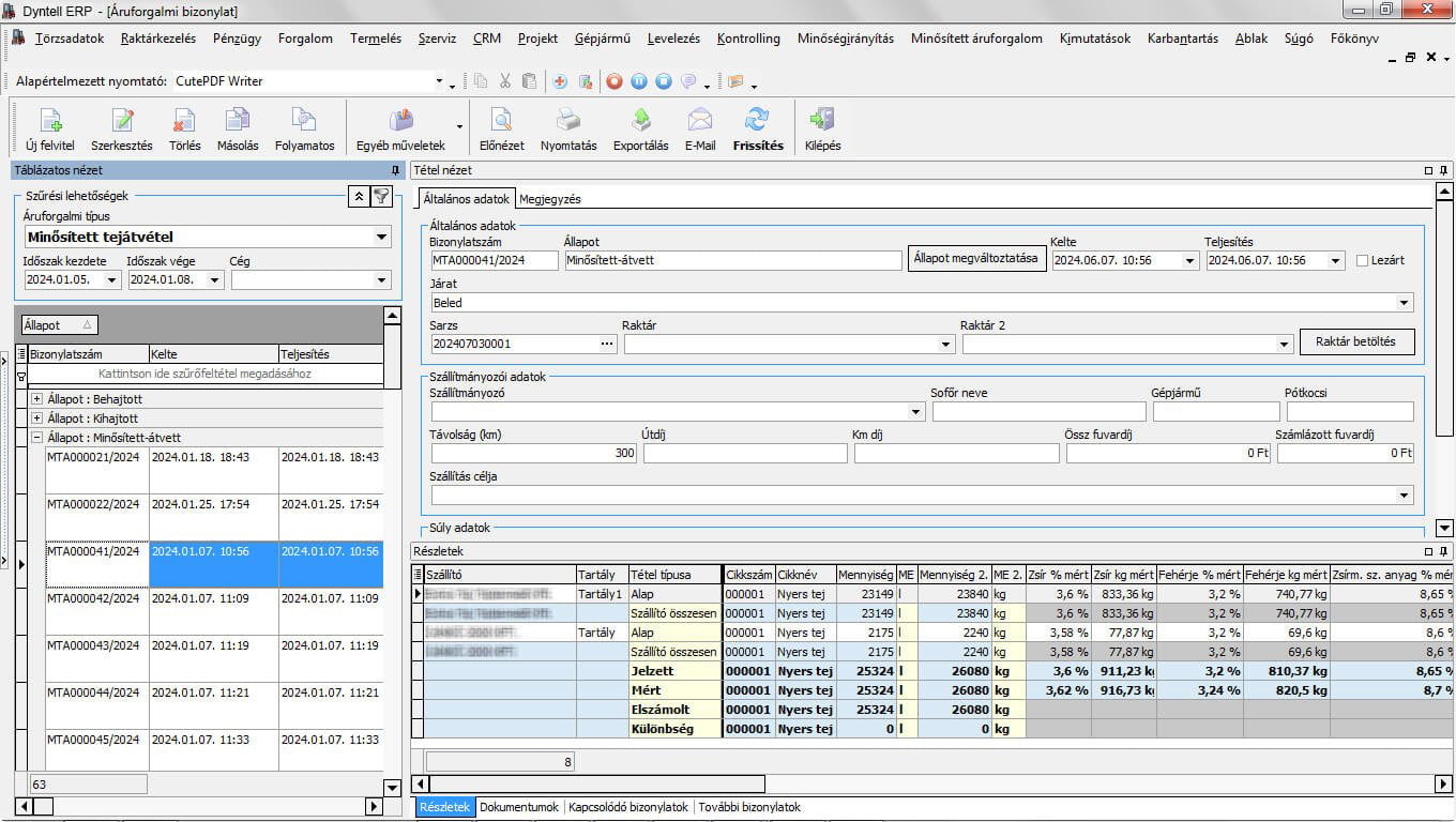 Az ömlesztett áru átvétele követhető és ellenőrizhető a rendszerben, legyen szó akár egy kocsin több beszállítótól származó áruról (például tej, gabona). A rendszer pontos elszámolást tesz lehetővé a gazdákkal, az adatok egyszerűen és gyorsan visszakereshetők. Az átvétel modul kommunikál az ERP többi részével, így a minősített áruátvételt követően az elszámolás (jóváírások, bónusz-málusz számítás) megoldott, a rendszer figyelembe veszi a hatósági árakat, valamint a gazdákkal kötött szerződéseket és megegyezéseket.